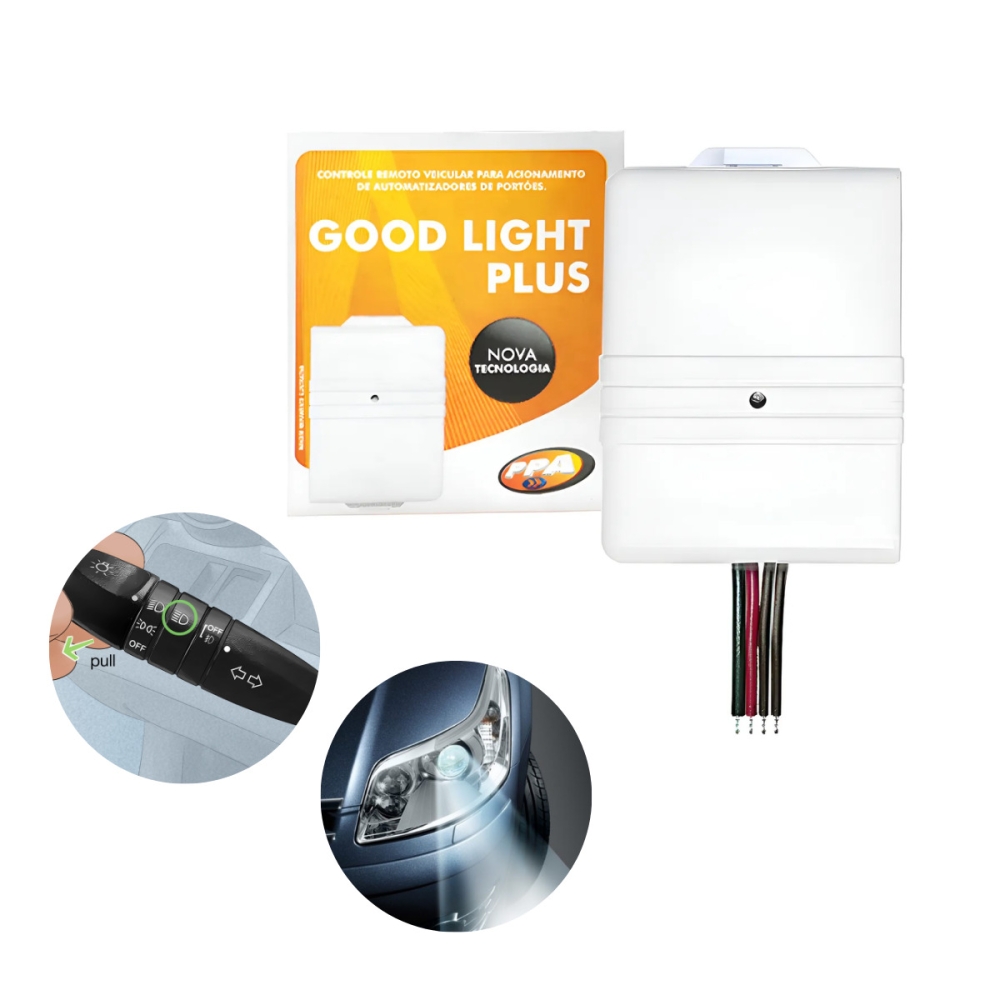 Controle remoto para acionamento de automatizadores de portões. Instalado no interior do veículo, o Good Light aciona o automatizador com um simples toque na alavanca de luz alta do veículo. |